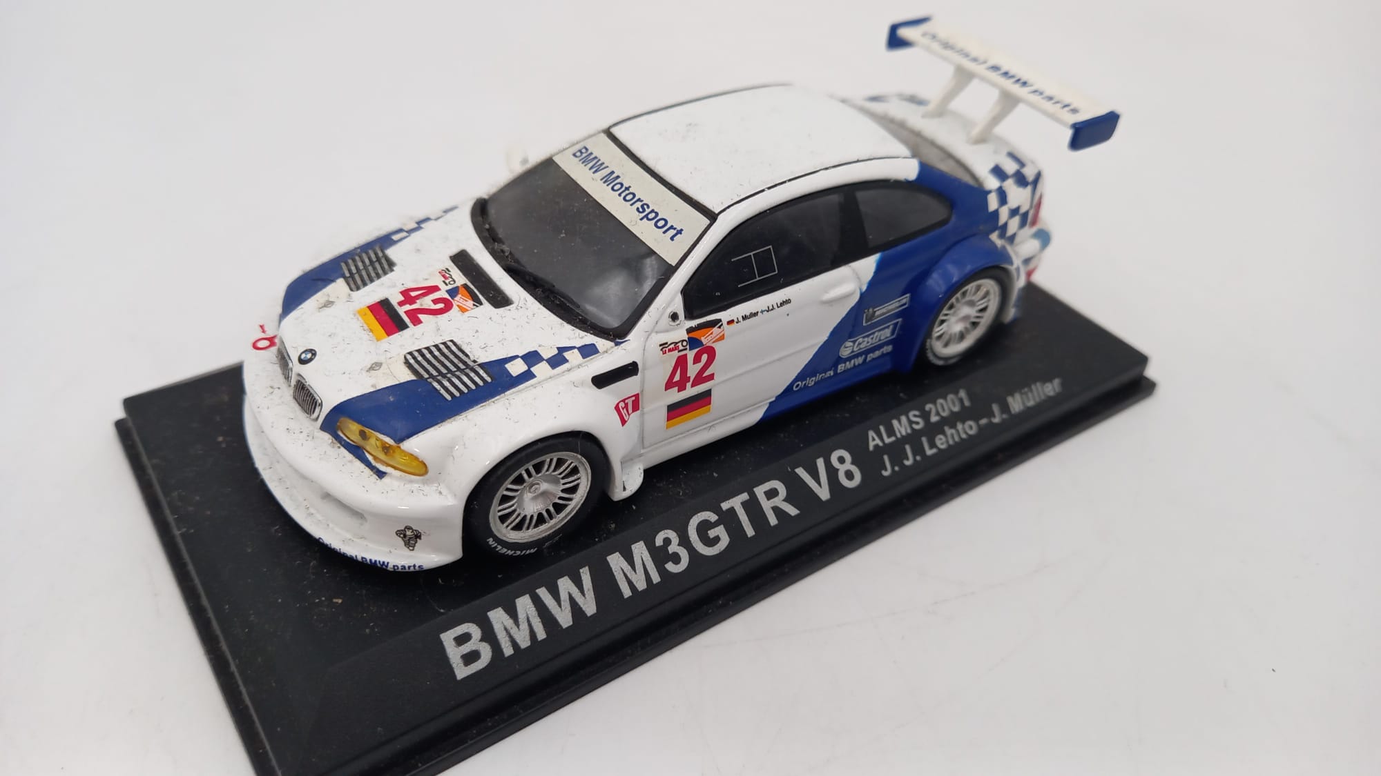 EDICOLA - AUTO DA CORSA BMW M3GTR V8 ALMS 2001 1/43, impolverata, da pulire, mancante specchio sinistro, senza scatola ori.. |