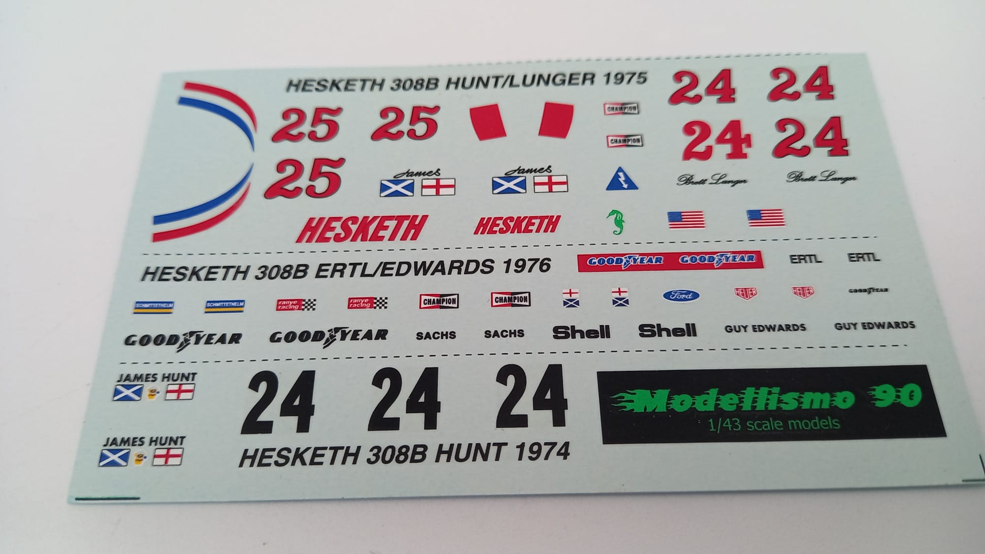 DECALS - F1 324 decals per Hesketh 308B 1974-75-76 1/43 |