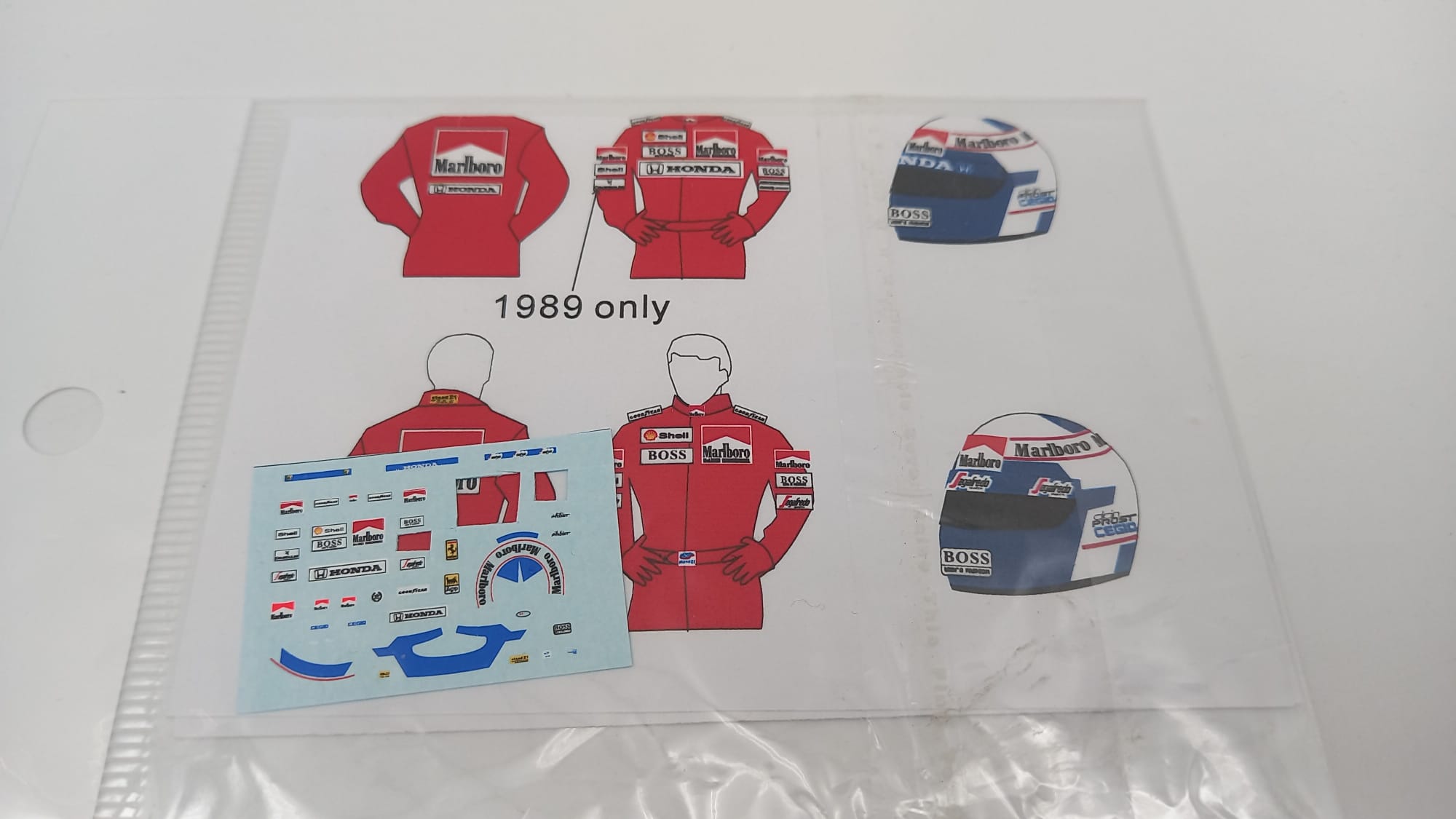 DECALS - F1 351 decals MSMD093 per casco e tuta Alain Prost 1/43, mancante di alcune decals |
