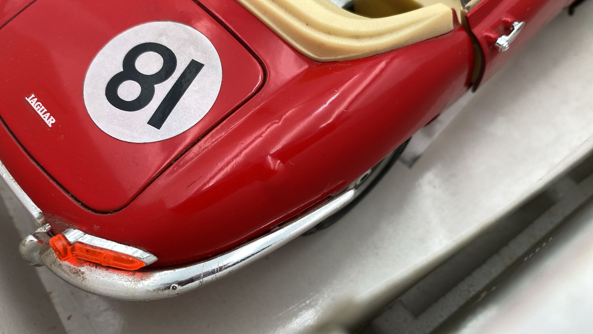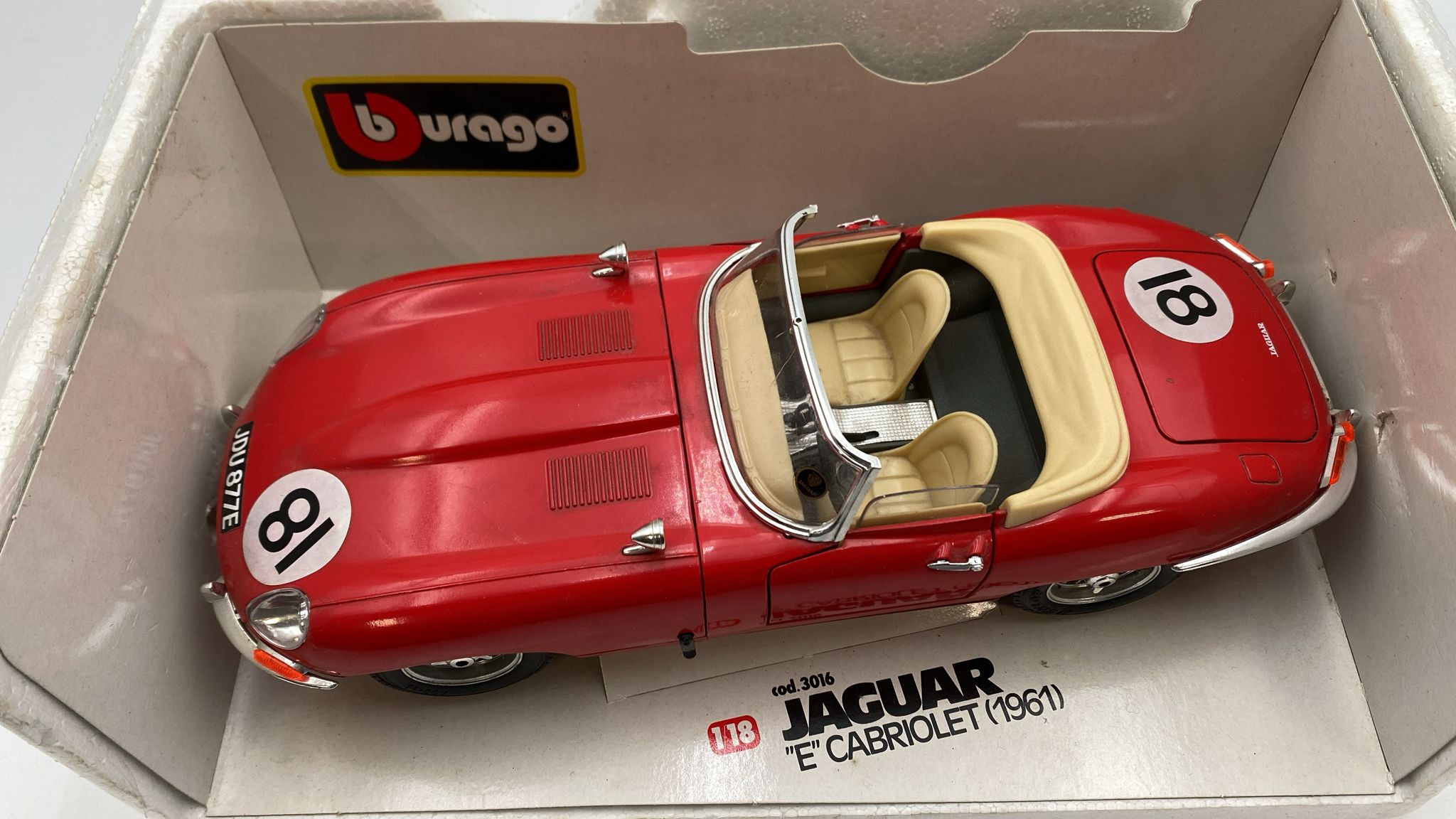 Bburago Jaguar E Cabriolet 1961 1/18 fioritura vernice, leggeri segni di usura