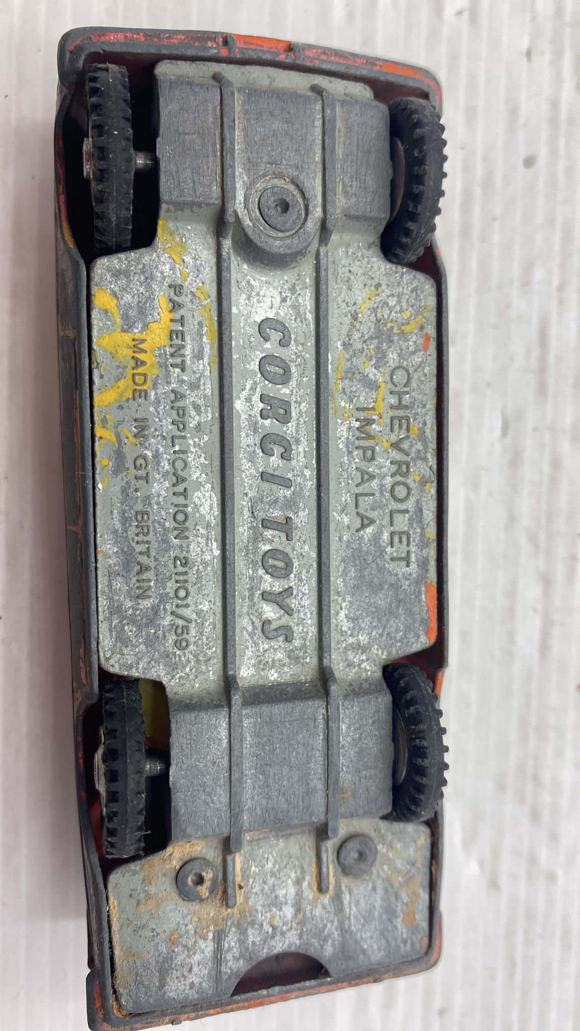 Corgi Chevrolet Impala 1/43, modello logorato e scolorito, senza scatola originale