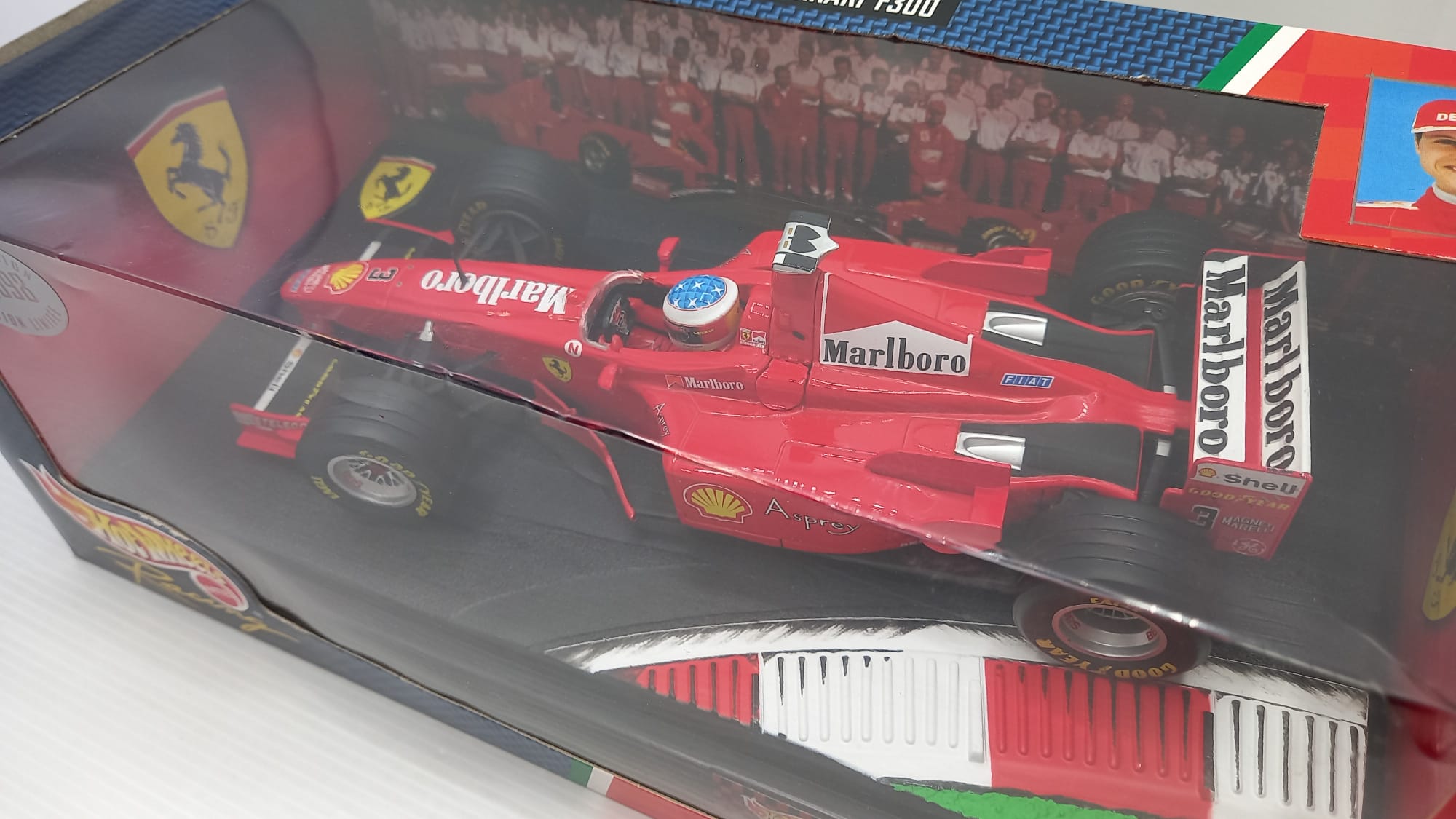 Hot Wheels Ferrari F300 M. Schumacher 1998 1/18, modificata con decals Marlboro