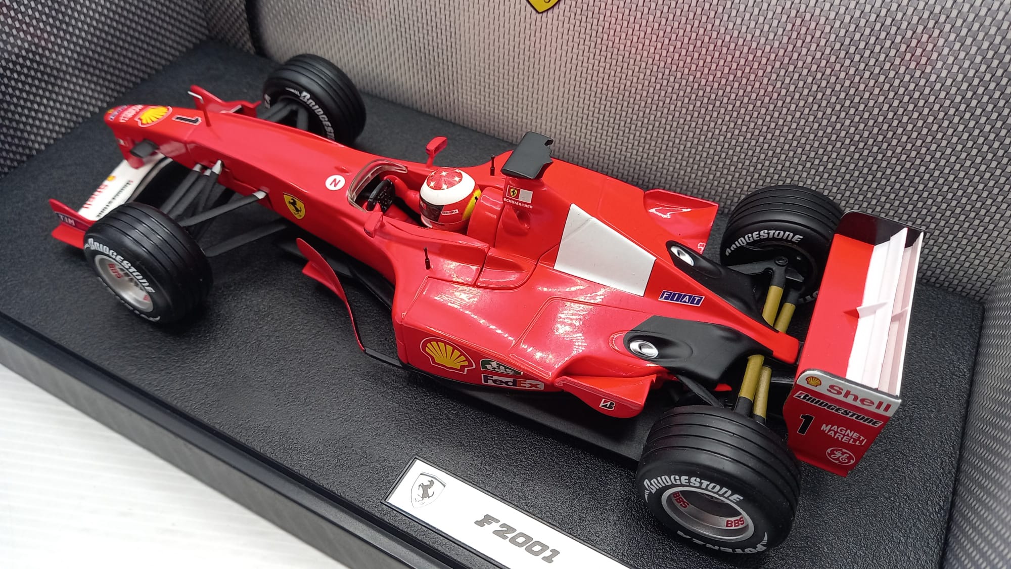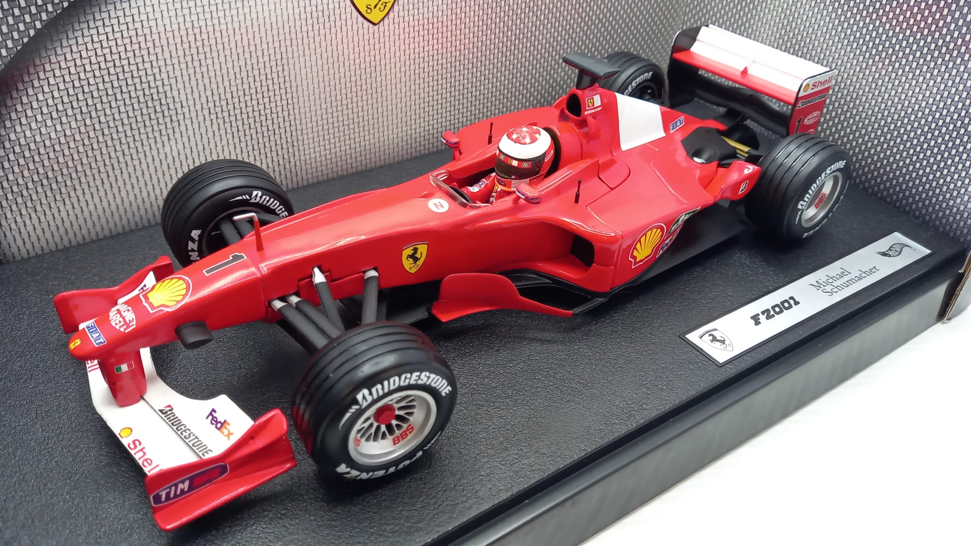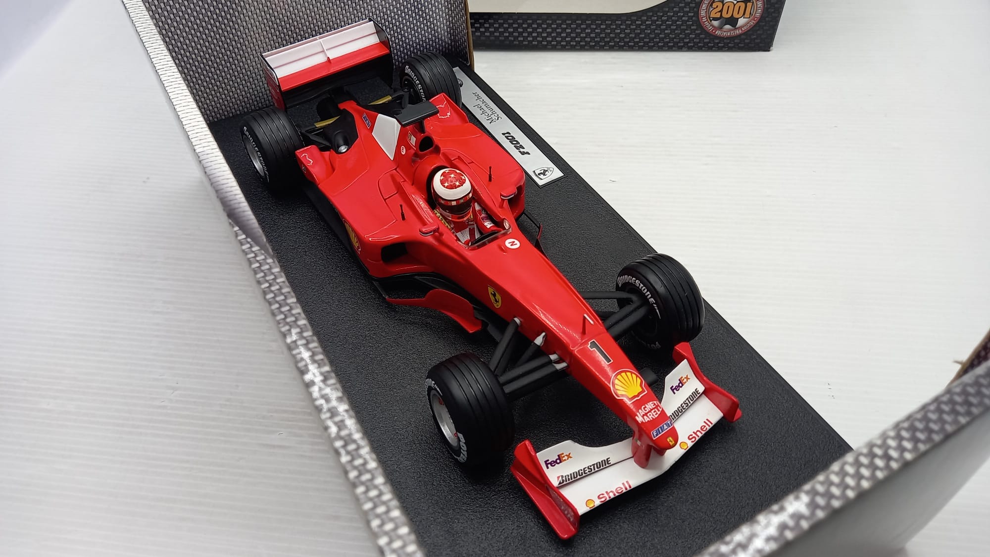 Hot Wheels Ferrari F2001 M. Schumacher 1/18, scatola lievemente usurata