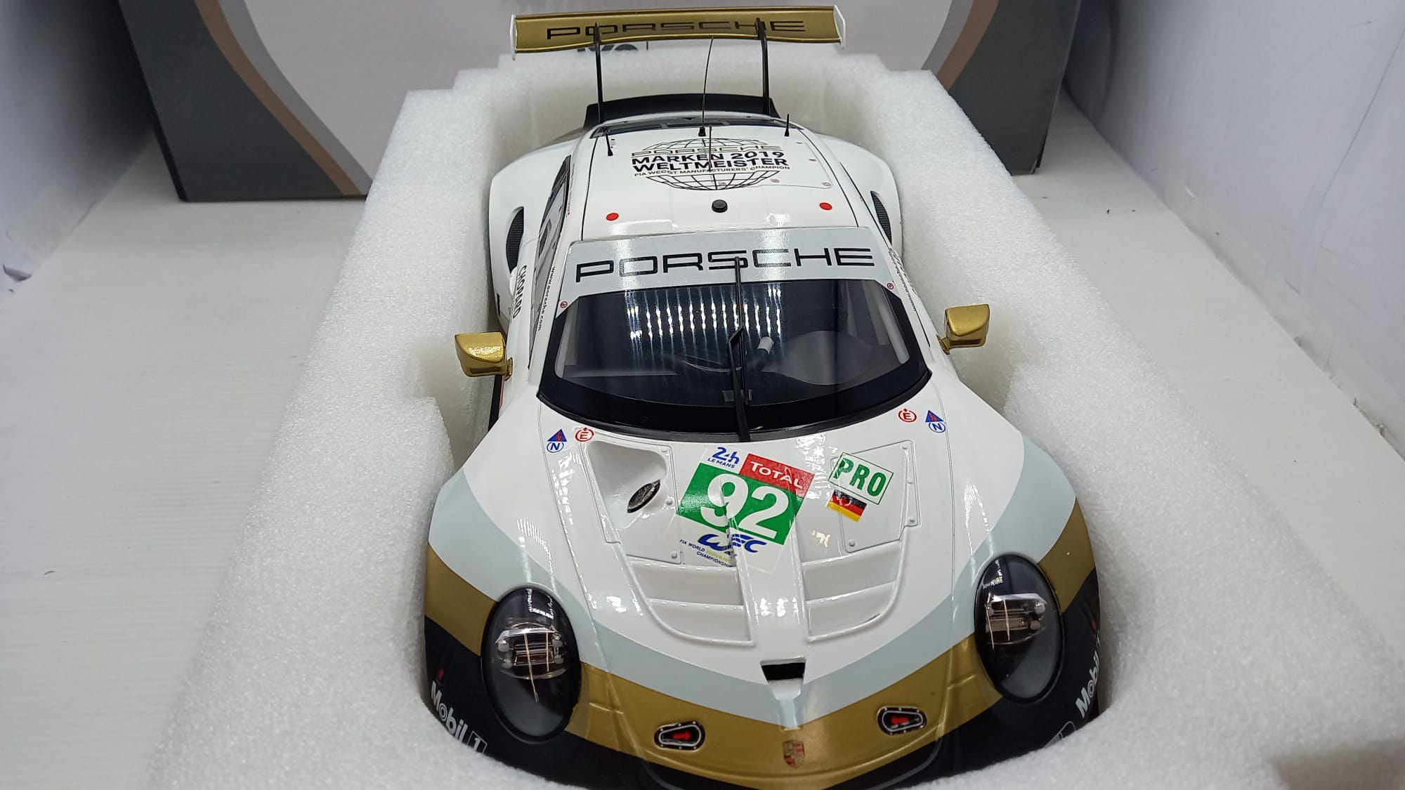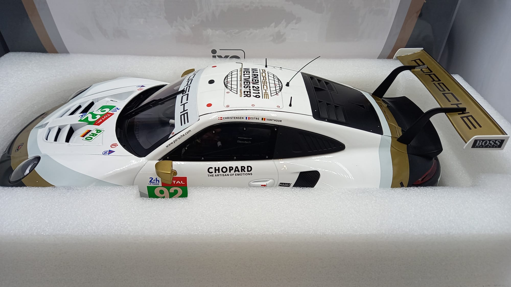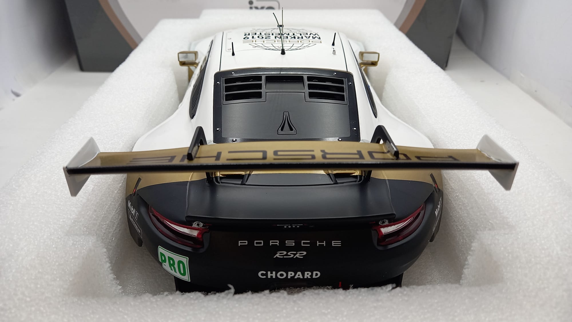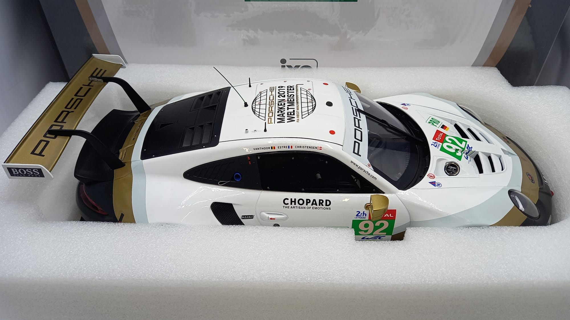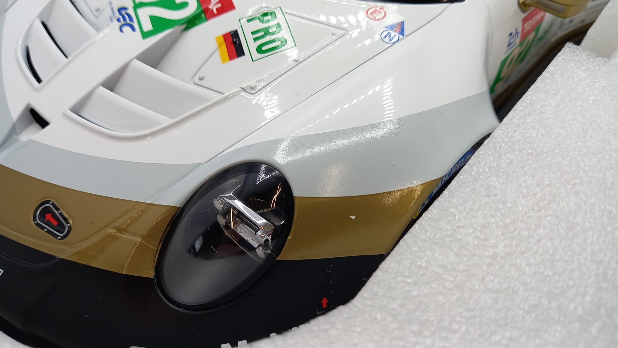 IXO Porsche 911 (991) RSR 24h Le Mans 2019 1/12, presenta un'imperfezione nella decals anteriore come mostrato in foto