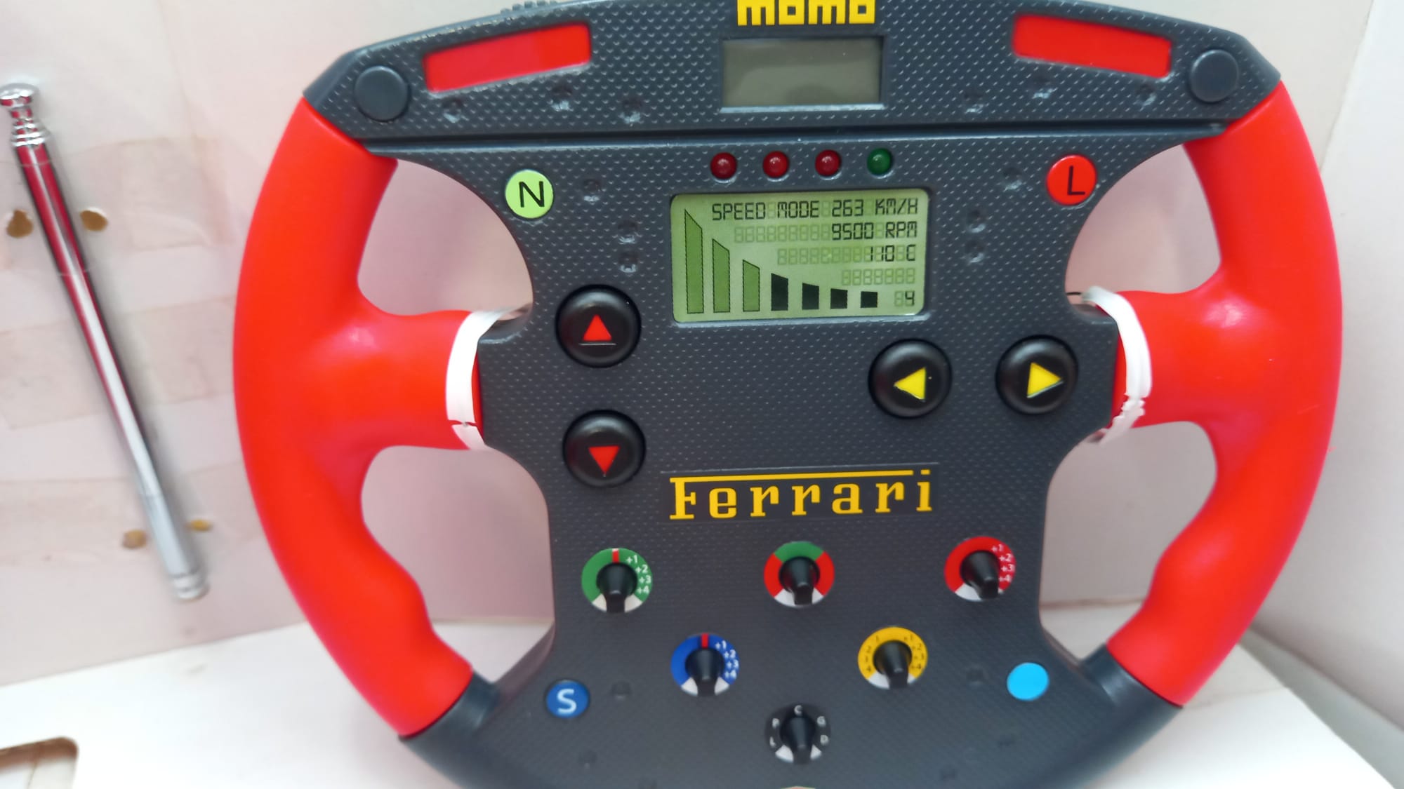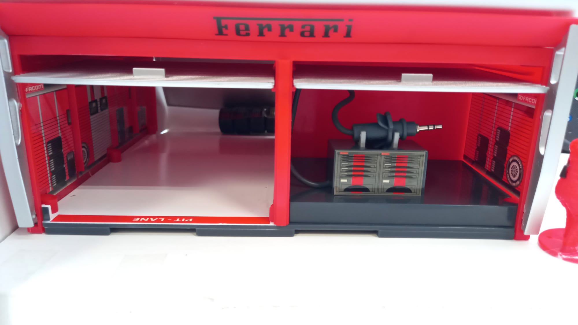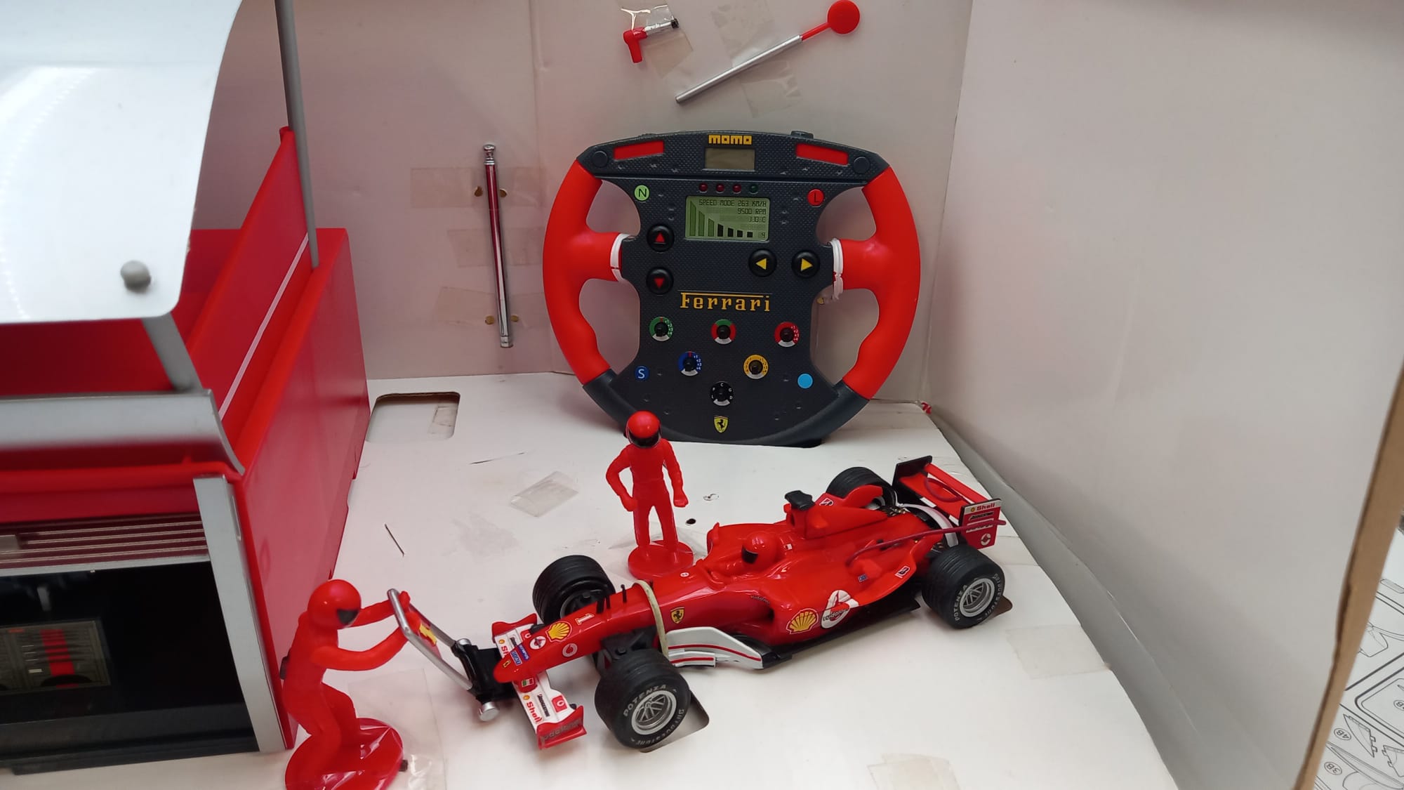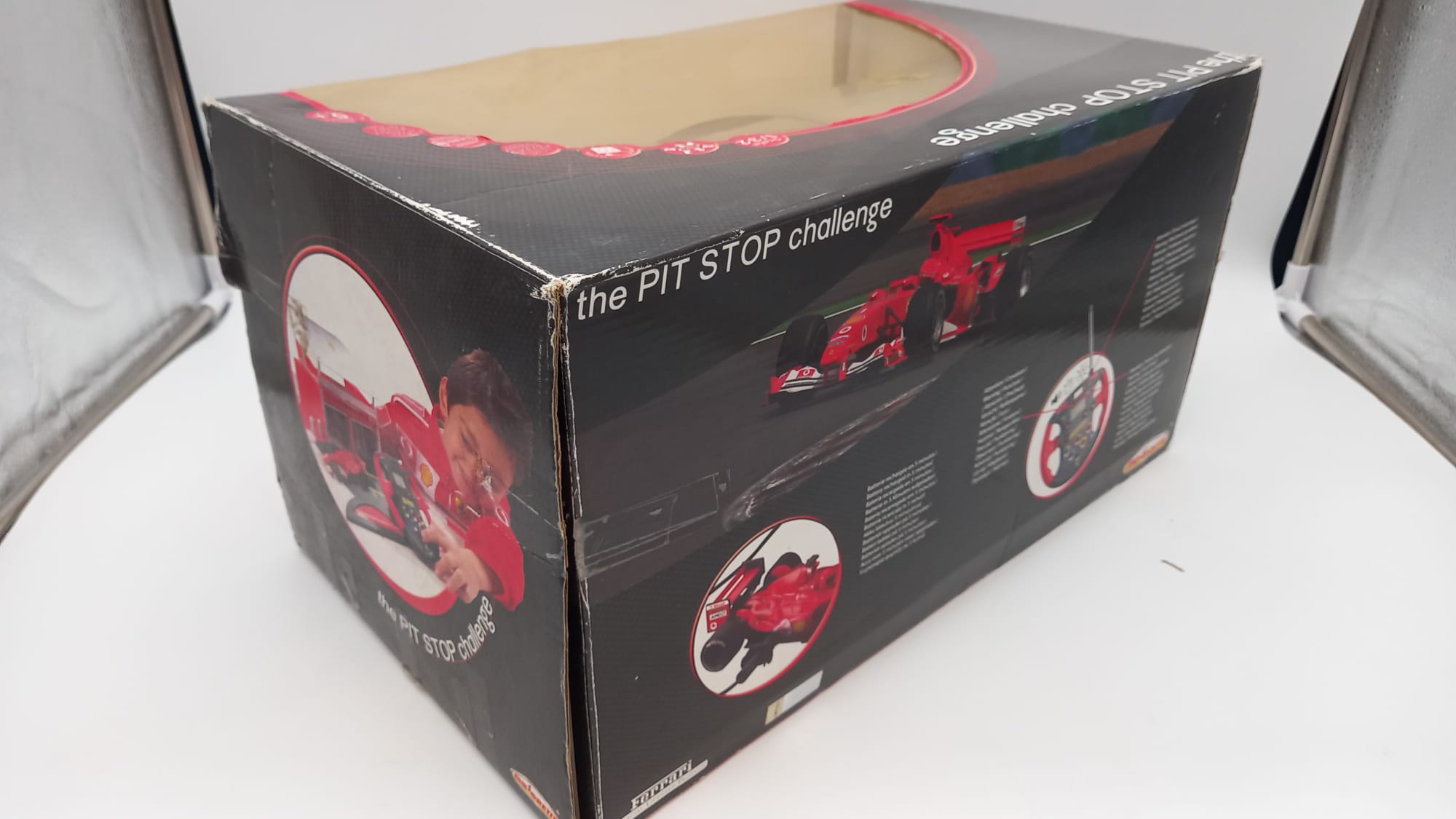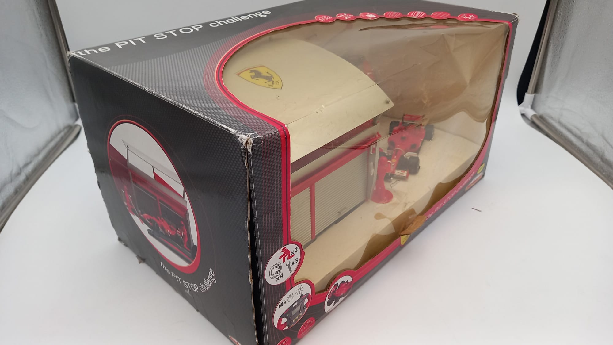Majorette Ferrari the Pit Stop challenge 1/32, modello radiocomandato con meccanici e box, confezione usurata