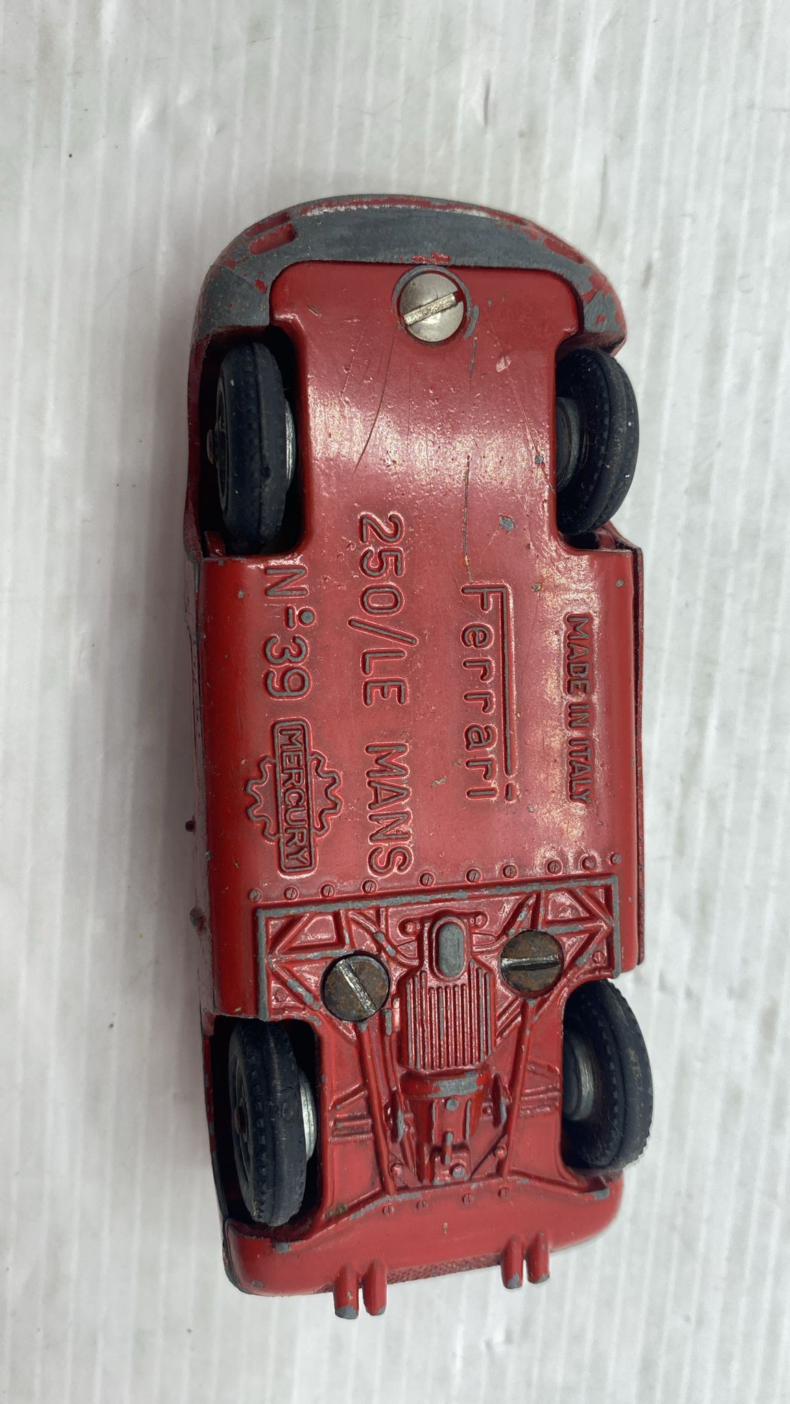 Mercury Ferrari 250 Le Mans 1/43 modellino vissuto e con segni di usura e vernice rovinata, bagagliaio rotto, senza scatola originale