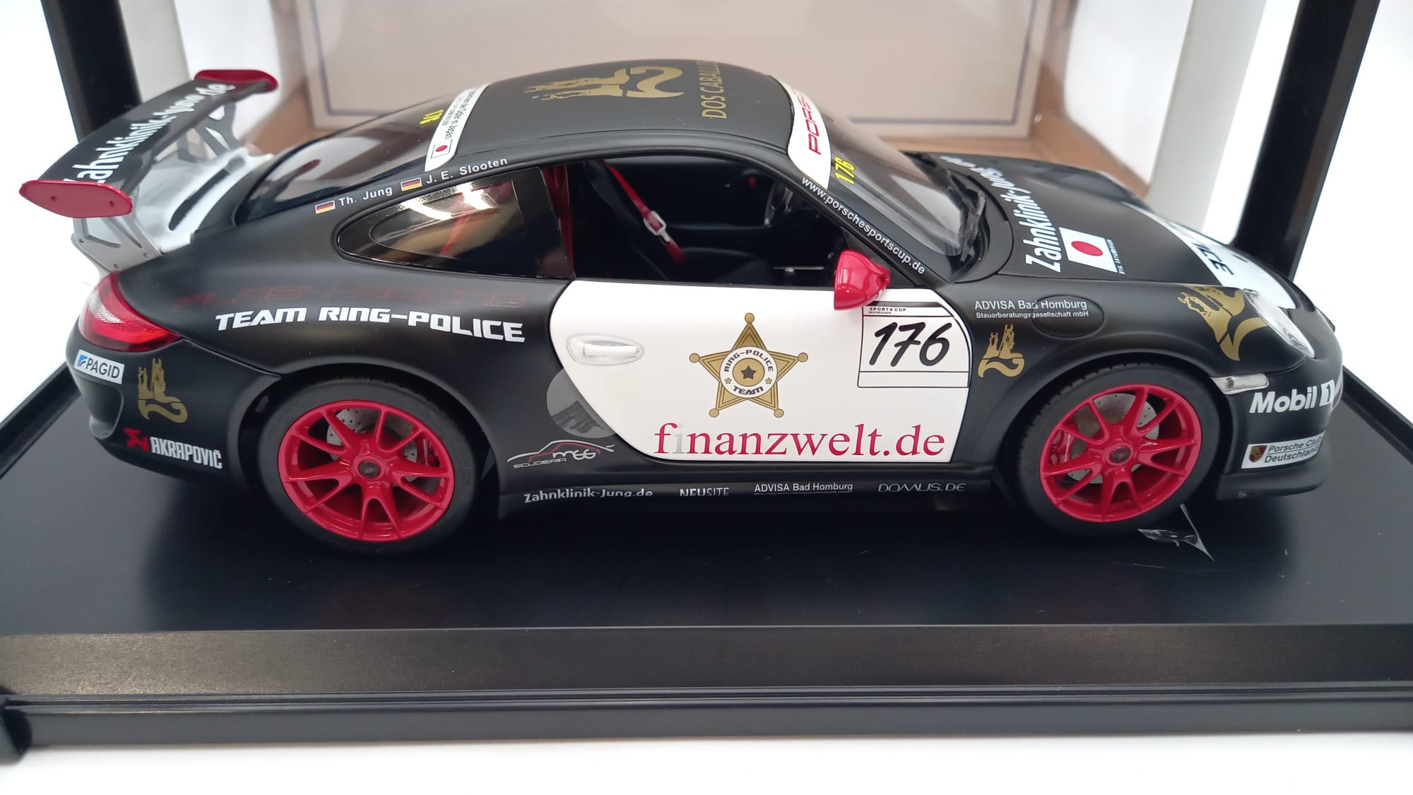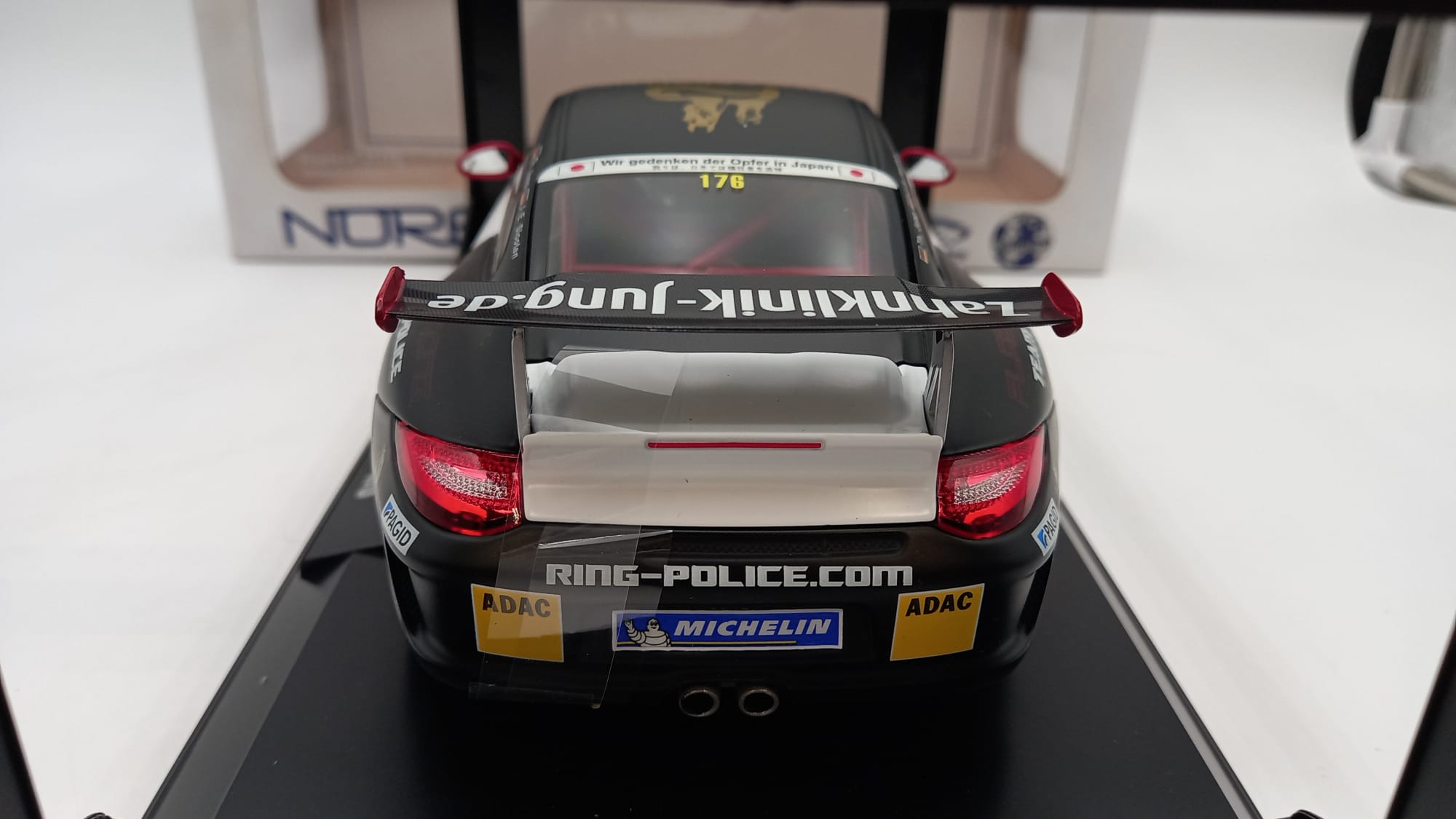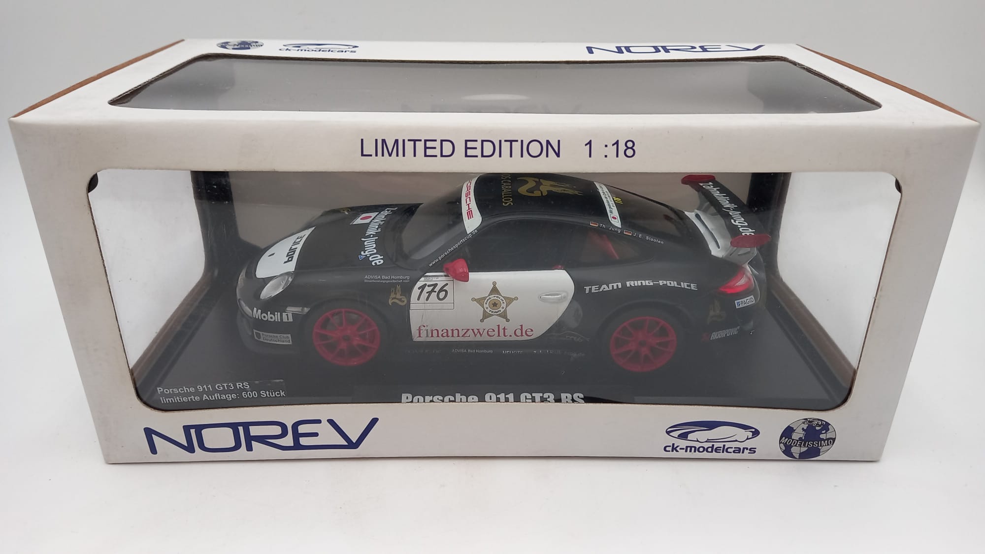 Norev Porsche 911 GT3 RS team racing Police 1/18, confezione lievemente usurata