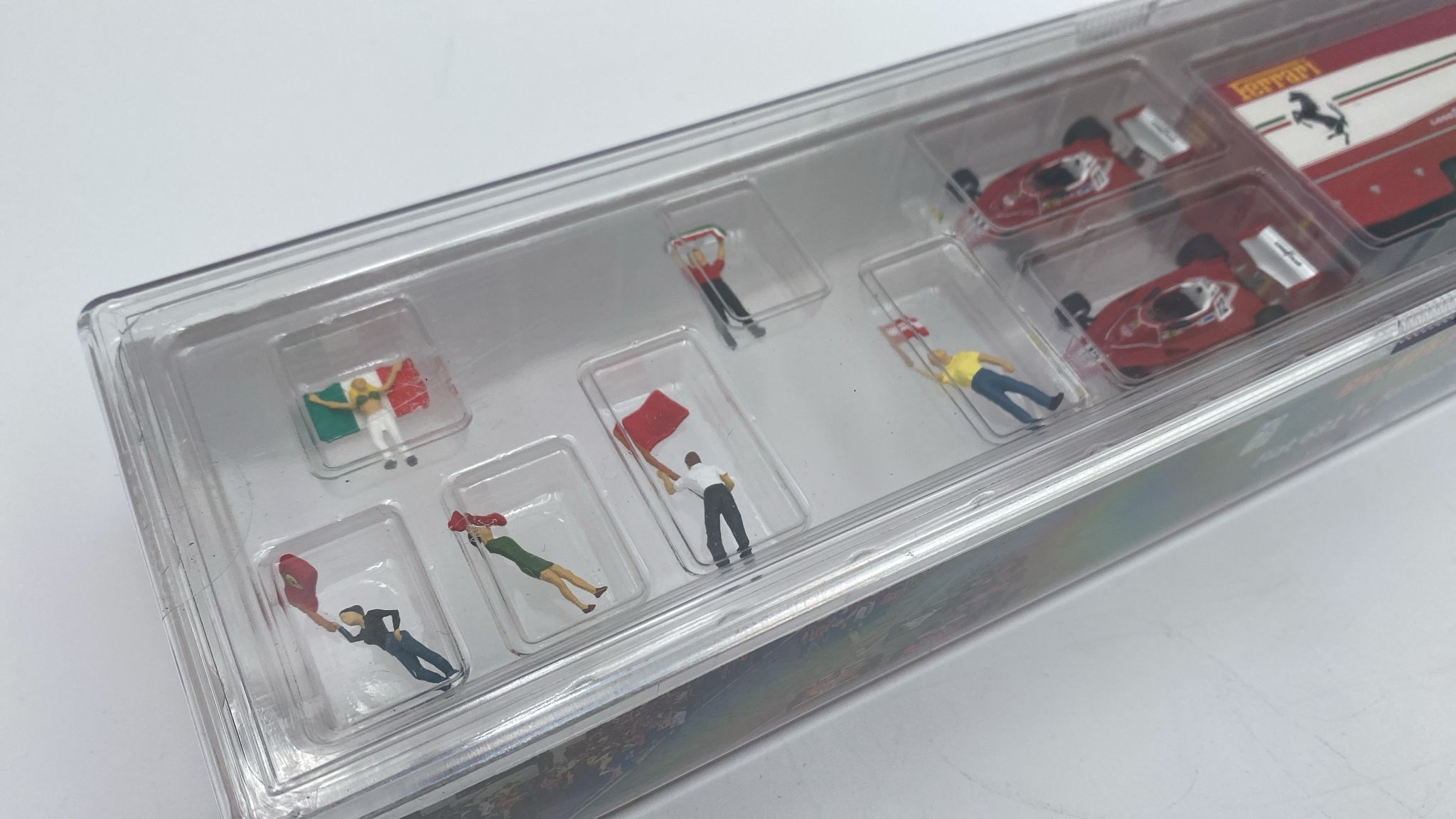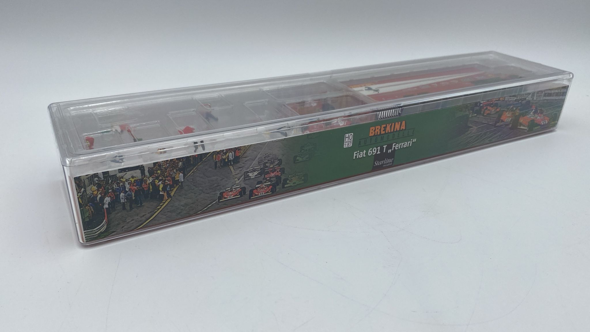 Starline Brekina Fiat 691 T Ferrari 1977 con 2 Ferrari 312 T2 F1 e set di 6 figurini di tifosi 1/87