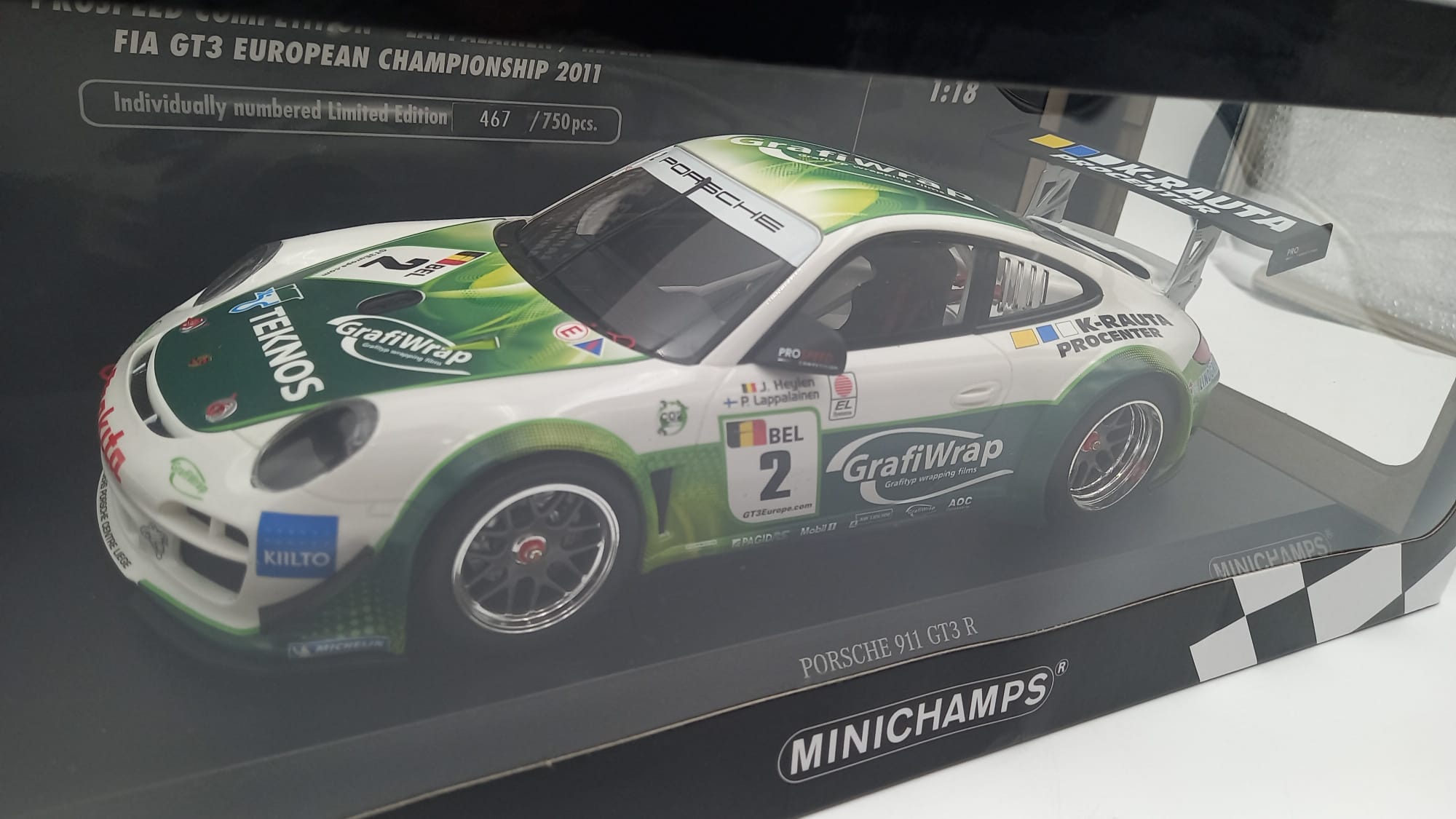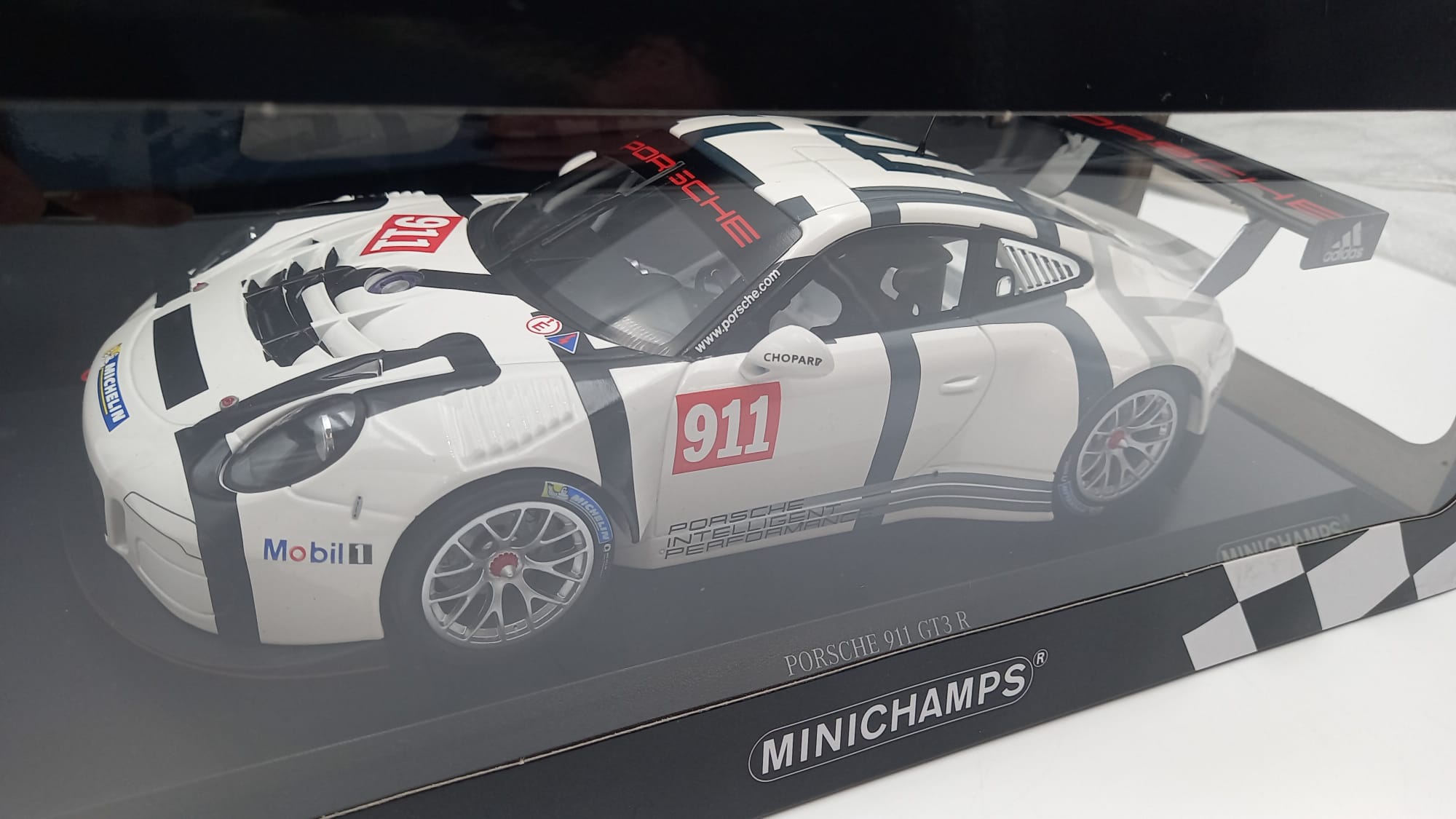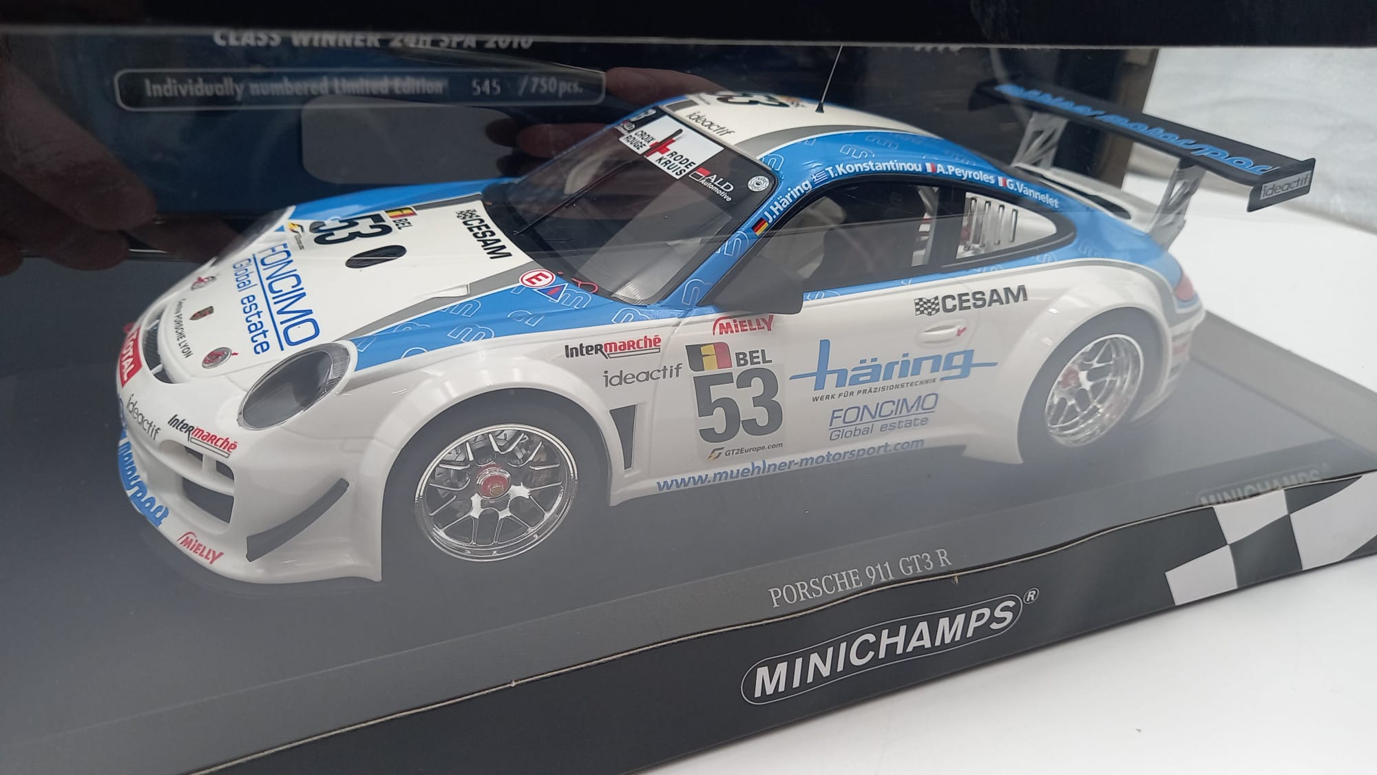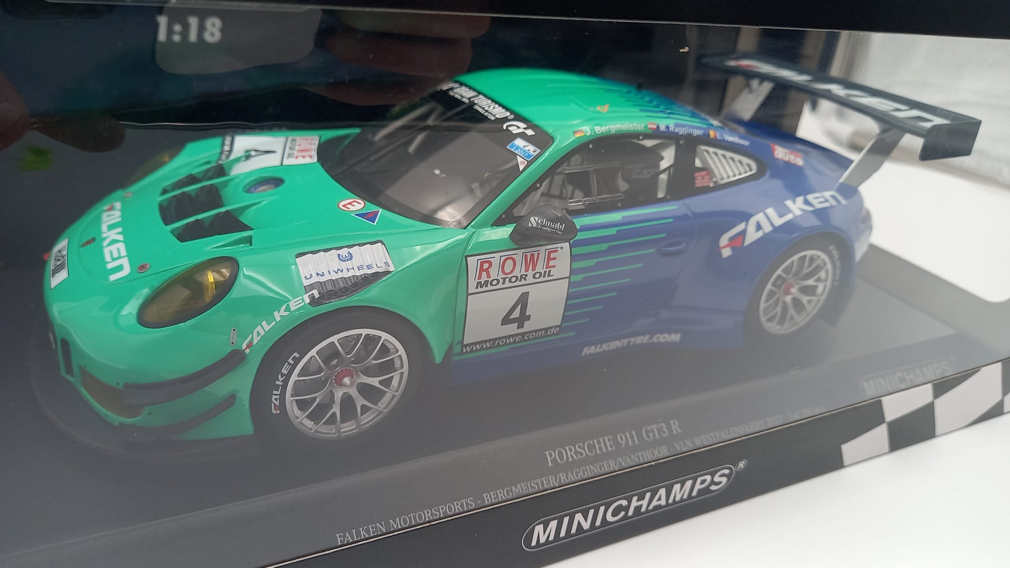 MINICHAMPS - AUTO DA CORSA Minichamps Porsche 911 GT3 R 24h SPA 2011 1/18, confezione rovinata nella parte trasparente